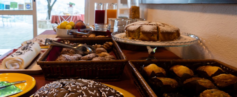 Rich and tasty, it is served in the breakfast room or on the terrace and prepared with fresh and genuine products, respecting everyone's tastes and needs. You can enjoy homemade cakes, pies and tarts, freshly baked croissants, homemade muffins and biscuits, pancakes, cereals, yoghurt, juices, fresh seasonal fruit. Each table also has its own basket with jams, nutella, butter, honey, rusks, all in single portions.